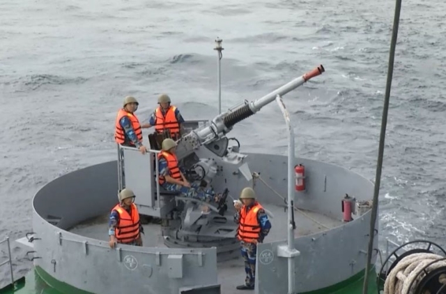 Uno de los puestos de tiro doble de cañones Bofors 40 mm del “Trần Khánh Dư”, si no fuera por los uniformes pixelado de los marinos parecería de la 2GM.