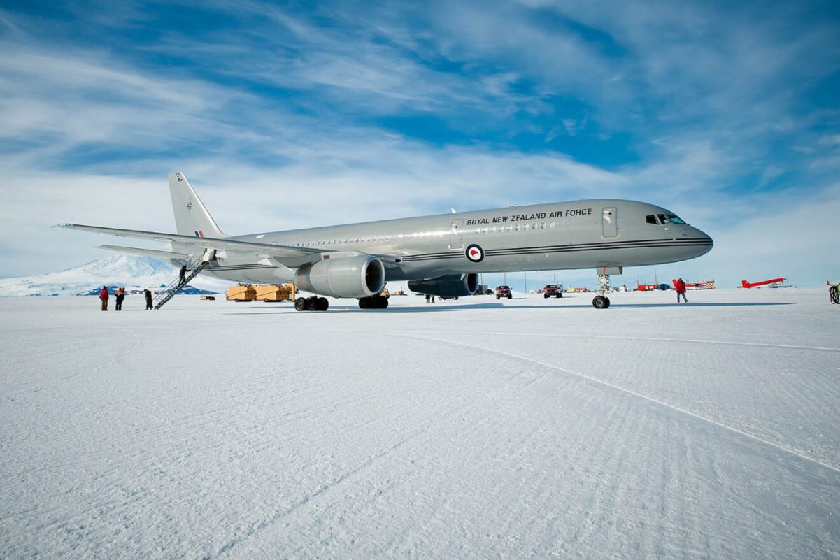Uno de los Boeing 757 de la Real Fuerza Aérea de Nueva Zelanda en la Antártida. (foto Ministerio de Defensa de Nueva Zelanda)