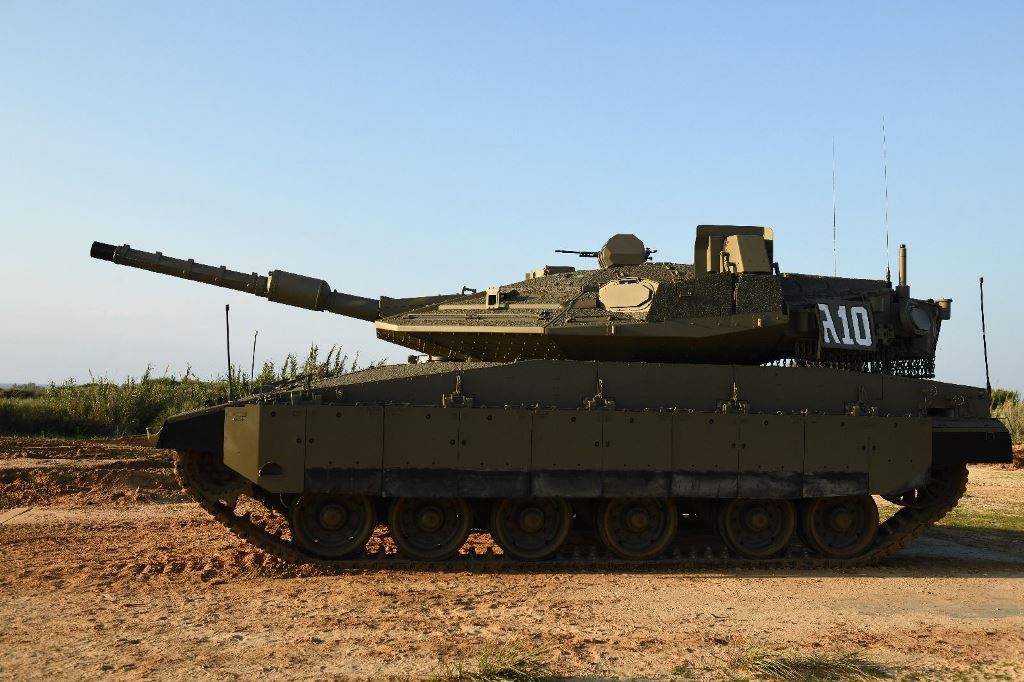 En esta toma lateral destaca el nuevo módulo electroóptico sobre la torre. Los módulos efectores del sistema Trophy también presentan nuevo diseño. (Ministerio de Defensa de Israel)