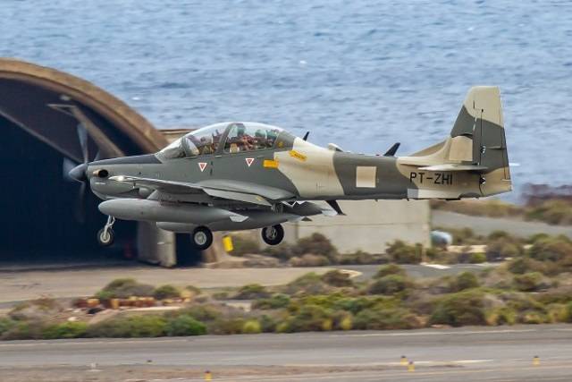 Imagen: Uno de los dos futuros EMB-314 de Turkmenistán aterrizando en Gando. (foto Antonio Rodriguez Santana)
