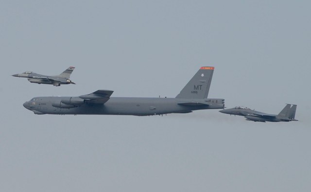 El más que veterano, pero todavía punta de lanza de la USAF, bombardero Boeing B-52 Stratofortress realizó un vuelo a baja altura escoltado por dos cazabombarderos F-15K Slam Eagle de la Fuerza Aérea de Corea del Sur y dos F-16 Fighting Falcon estadounidenses. Durante el simbólico acto se recordó que el B-52 es un bombardero de gran alcance, que puede volar hasta 15.000 metros de altura y transportar y lanzar con plena precisión hasta 31.500 kilogramos de armamento nuclear o convencional, ya sea inteligente o de caída libre.
