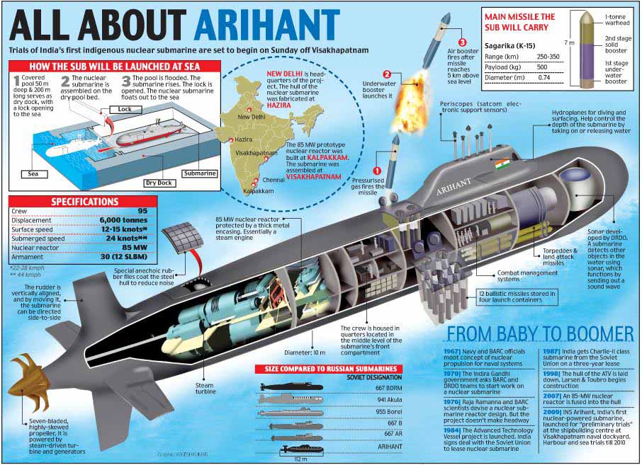 Sus dimensiones y desplazamiento se acercan sobremanera a los de la extinta serie de SSBN estadounidenses de la clase George Washington: 110 metros de eslora por 11 de manga, en el caso que nos ocupa (112 por 10.2 en el de los SSBN de la US Navy aquí comparados). Oficialmente, elArihant desplaza poco más de 6.000 toneladas. Pero, dados esos parámetros, cabe suponer que bien pudiera alcanzar las 7.000 en inmersión. Su dotación ofensiva (tubos lanzatorpedos al margen, que en este tipo de buques tienen más bien una vocación defensiva) se basa en la disponibilidad de 4 silos para misiles de lanzamiento vertical en inmersión. No son muchos, pero la explicación puede radicar en que cada uno de ellos alberga 3 misiles del tipo K-15 Sagarika(también de diseño nacional). Se trata de ingenios que con su máxima carga bélica (una cabeza de una tonelada) pueden alcanzar una distancia modesta para un auténtico SLBM: 750 kms, pero muy relevante en función de la reseñada capacidad para operar con gran sigilo. Técnicamente, esa distancia sólo justificaría hablar del buque como un SSGN y no de un SSBN, aunque seguramente asistiremos a un baile de siglas en los próximos meses, hasta que los especialistas consensuen la mejor opción. Sin embargo, existe otra opción para ampliar el radio de acción de esos misiles: reduciendo esa carga a 180 Kgrs, el alcance eficaz del K-15 se acerca a los 2.000 Kms.