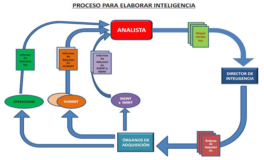 En cualquier caso, lo normal será que el analista nunca esté satisfecho con la información de que dispone para elaborar su inteligencia, lo que le inducirá continuamente a solicitar información al organismo OSINT, a sus fuentes, a proponer nuevas órdenes de adquisición y operaciones, que, tras su aprobación por sus jefes y por el Director de Inteligencia, serán remitidas a los órganos de obtención correspondientes. Otras fuentes con las que también puede contar es con los Servicios aliados, de forma directa o a través de los Clubes de los que formen parte el CNI y aquellos. De esta forma se mantiene el proceso de elaboración de inteligencia: reconocimiento de necesidades de información → propuesta de requerimientos → remisión de órdenes de adquisición a los órganos de obtención → respuesta de estos → elaboración de inteligencia.