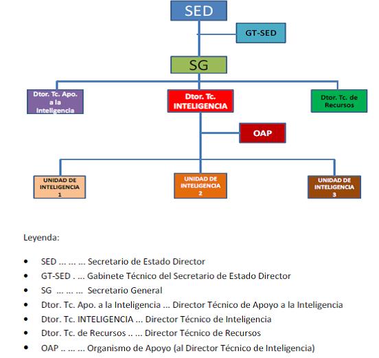Esta misma legislación establece en su artículo 5 que "Las actividades del CNI, así como su organización y estructura interna, medios y procedimientos... constituyen información clasificada, con el grado de secreto...", por lo que la exposición que se realiza a continuación se basa en la estimación que efectúa su autor, de acuerdo con los conocimientos que le proporcionan la legislación vigente, los principios de teoría orgánica y los textos relativos al Ciclo de Inteligencia que se encuentran publicados o disponibles en internet.