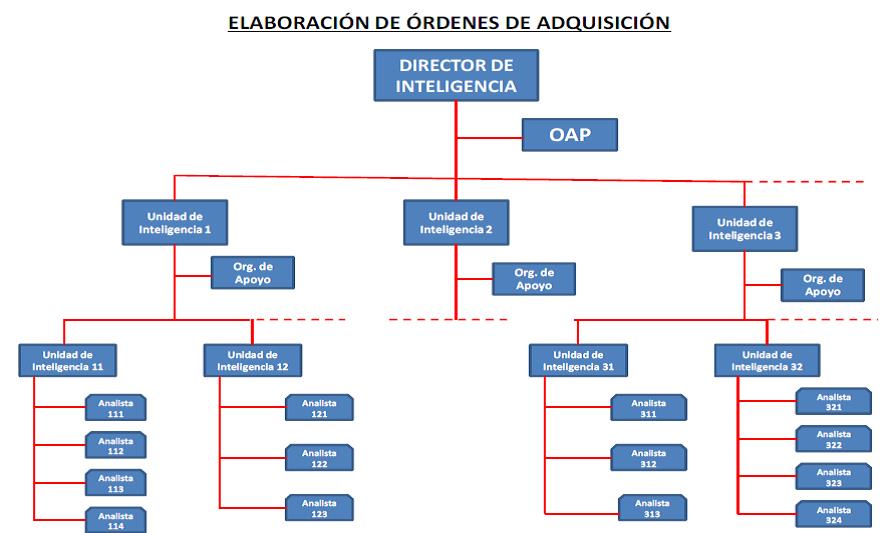 Asimismo, en las ocasiones en que no existan fuentes accesibles o las condiciones del origen de la información lo permitan, puede ser necesario recurrir a procedimientos especiales de obtención de información. Para ello, el analista propondrá la intervención del organismo de adquisición por procedimientos especiales. Si esta propuesta es aprobada por sus jefes de inteligencia, la solicitud convenientemente documentada se dirigirá al Director de Inteligencia. Tras el estudio de la solicitud por el OAP, aquel, si aprueba su realización, ordenará el estudio conjunto de sus posibilidades de realización entre el analista y los organismos auxiliares de su unidad de inteligencia, por una parte, con la unidad de apoyo a las operaciones del organismo de adquisición por procedimientos especiales, de otra. A este estudio conjunto asistirán también representantes del OAP, que serán los encargados de exponer al Director de Inteligencia la conveniencia o no de ejecutar la operación, sus ventajas, inconvenientes y posibilidades. Tras tomar la decisión el Director de Inteligencia, en caso de que esta sea afirmativa, el OAP, con el asesoramiento de la unidad de apoyo a las operaciones, establecerá las condiciones de ejecución.