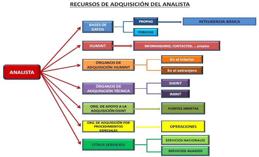 Para ello, cada analista, en su área de responsabilidad, sabe que cuenta, además de con su propia capacidad de adquisición directa (OSINT y HUMINT) con unos órganos de obtención humanos (HUMINT), otros técnicos (SIGINT e IMINT) y la posibilidad de recurrir a otros Servicios (nacionales y aliados) que puedan adquirir o proporcionarle la información que precisa.