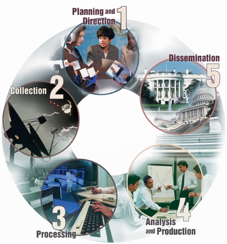 En la comunidad de inteligencia norteamericana las fases del ciclo reciben otro nombre, y se distingue la fase de obtención de la de procesamiento, por lo que son cinco etapas: