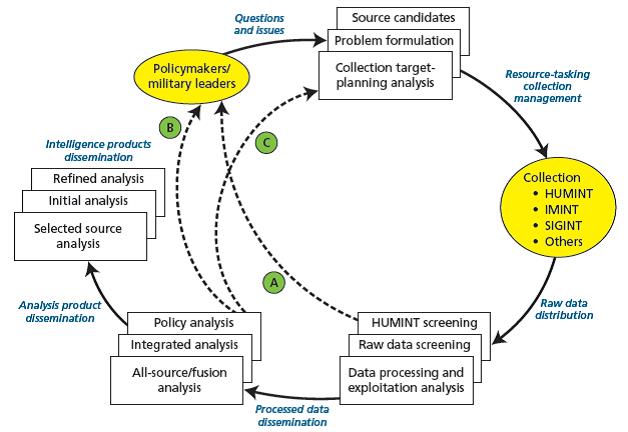 Las líneas con puntos del gráfico señalan la existencia de atajos entre una y otra fase: (A) el tránsito de informaciones no analizadas desde la fase de Obtención al decisor político (o militar en caso de que el ciclo describa el funcionamiento de ese tipo de inteligencia); (C) el de indicaciones de los analistas a la del Planeamiento previo a la Obtención; y (B) el que comunica la fase de Elaboración con los consumidores, sin pasar plenamente por selección y refinamiento de los análisis en la fase de Difusión.