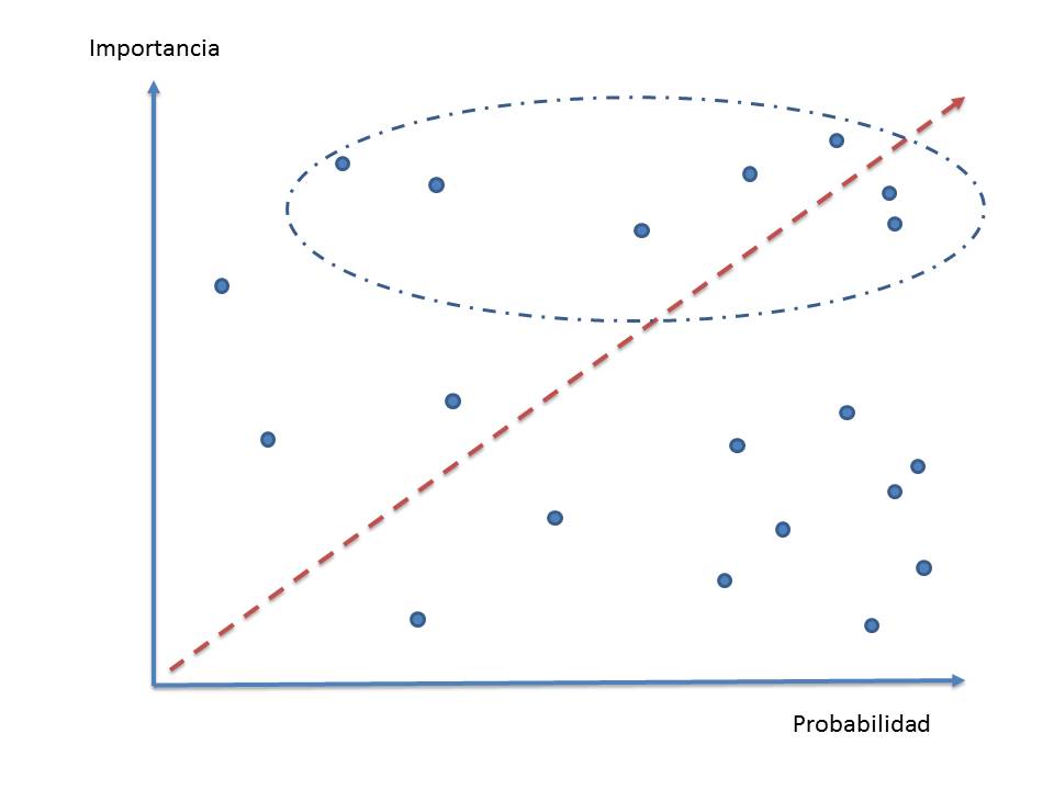 Por otro lado, la limitación de recursos obliga a establecer prioridades entre los objetivos. Esto supone que los últimos de la lista quedan menos cubiertos y que en ellos haya más ‘sombras radar’. Mark Lowenthal señala como como criterios la importancia y la probabilidad de que la amenaza o la oportunidad se presenten. El gráfico inferior representa los dos criterios con una tendencia creciente. Los puntos comprendidos en la elipse ocuparían los primeros puestos en el orden de objetivos.