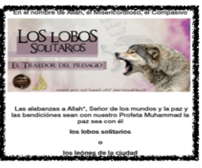 - Febrero de 2015: El Frente Mediático para el apoyo al Estado islámico al-Khilafah Media Foundation difundió en varios idiomas un artículo titulado “Los lobos solitarios”: “Ellos (los lobos solitarios) toman como ejemplo a sus predecesores (...) se rebelan contra la humillación y salen a las calles de Madrid, Texas, Sidney con cuchillos que portan en sus manos blancas para rasgar los vientres y decapitar las cabezas (...) Sentiréis el aliento cuando seáis discretamente aniquilados en las calles de Londres, Madrid y Sidney”. El mismo documento hace referencia al éxito del mensaje de audio en árabe –pero traducido a varias lenguas como el inglés o francés–que difundió el 22 de septiembre de 2014 Abu Muhammad al-Adnani en el que realizaba un llamamiento a matar a ciudadanos que formasen parte de la coalición internacional. En dicho mensaje especificaba que “si no eres capaz de encontrar una bala o un IED entonces selecciona al impío americano, francés o a cualquiera de sus aliados. Golpéale la cabeza con una roca, asesínale con un cuchillo, pásale por encima con el coche, tírale desde un lugar muy alto, estrangúlale o envenénale (...) No preguntéis a nadie, no busquéis su veredicto” continuaba Adnani con la intención subyacente de inspirar ataques individuales del modo más clásico. Según el documento “Los lobos solitarios” tras el mensaje de al Adnani “hemos visto cosasincreíbles, empezando por Estados Unidos (...) matar a los oficiales de la policía y soldados en las calles de Nueva York, golpear a los guardias de la sede del parlamento en Ottawa (...) y especialmente en Francia!”.
