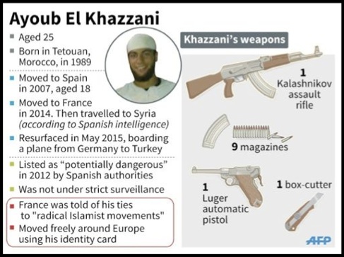 21 de agosto de 2015: Ayoub el Khazzani, marroquí de 26 años, tras comprar en efectivo un billete de primera clase subió en Bruselas (Bélgica) a un tren Thalys que realizaba el trayecto entre Amsterdam y Paris. El Khazzani accedió al tren armado con un fusil AKM, nueve cargadores, 270 cartuchos, una pistola Luger, un cúter y una botella de gasolina. Una vez en el interior del tren visionó en su teléfono móvil un nasheed antes de dirigirse al baño para cargar el fusil. Fue precisamente el ruido producido por el manejo del arma lo que alertó a dos soldados norteamericanos que se encontraban en el vagón. Tras salir del baño varios pasajeros forcejearon con el Khazzani que disparó en una ocasión.Finalmente pudo ser reducido y desarmado aunque hirió a dos pasajeros. El valor y la solidaridad de los pasajeros evitó, probablemente, un atentado de alta letalidad por las características del escenario y la capacidad –fusil AKM con una cadencia de tiro de 600 balas por minuto– del Actor Solitario. Tras su detención el Khazzani alegó que su intención era robar y que las armas las había encontrado de forma fortuita en un parque de Bruselas.El Khazzani había residido en España –concretamente en Madrid y Algeciras– durante siete años. En el año 2009 fue detenido por tráfico de drogas e ingresó en la cárcel. Su proceso de radicalización pudo haberse iniciado en la prisión, al igual que otros Actores Solitarios como Mehdi Nemouche o Mohamed Merah. En 2012 ya mantiene vínculos con el islamismo radical y en 2014 abandona España al caducar su permiso de residencia. Los servicios de inteligencia españoles alertaron a sus colegas europeos del perfil “potencialmente peligroso” de Ayoub el Khazzani. Pocos meses después se desplazó a Turquía a la espera que algún facilitador le ayudara a pasar a Siria. Una vez en Siria se unió a una facción de Jabhat al Nusra aunque poco después se enroló en DAESH. Durante su estancia en Siria consolidó su proceso de radicalización y adquirió experiencia en el manejo de armas. El hecho de intentar ejecutar un atentado en el tren que une Amsterdam y Paris parece sugerir que se trate de un retornado con directrices del DAESH para cometer atentados en Occidente al igual que Mehdi Nemouche, o más recientemente Abdelhamid Abaaoud. De hecho, es posible que Ayoub el Khazzani hubiese tenido algún tipo de contacto durante su estancia en Siria con este último.