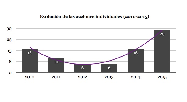 La anterior gráfica muestra una tendencia al alza de las acciones individuales durante el año 2015 y supera las cifras del año 2010, período de máxima influencia del clérigo Anwar al-Awlaki y del año 2014 cuando se crea el Califato del DAESH.