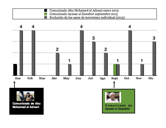En enero de 2015 Abu Mohamed al Adnani, portavoz de DAESH, difundió un audio –que parece tener cierta incidencia en el aumento de casos– en el que instaba a cometer atentados individuales en Occidente. En septiembre, Ayman al Zawahiri emite un comunicado que también parece tener cierta incidencia, aunque más discreta, en el aumento de casos durante el mes octubre: