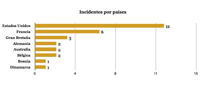 En Europa el país con mayor incidencia de casos es Francia con seis, seguido de Gran Bretaña con tres casos. Estados Unidos ha contabilizado doce casos y ha incrementado en seis los episodios de terrorismo individual respecto al 2014. Australia también ha sido afectada por dos episodios de terrorismo individual.