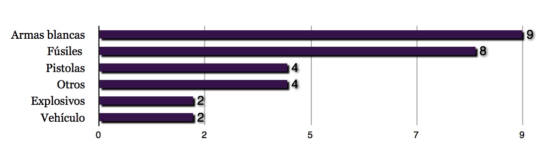 Una variable nos debe alertar especialmente en la operativa de los Actores Solitarios. A pesar de la predilección, debido a su fácil acceso, por las capacidades blandas (armas blancas o vehículos de motor) durante el año 2015 se observa una mayor utilización de capacidades más letales como fusiles de asalto o pistolas. El uso, en diferentes acciones terroristas, de fusiles AK-47, AKM o VZ 58 Compact sugiere un mayor acceso de los Actores Solitarios al mercado de las armas de guerra. La amateurización inherente al terrorismo individual ha evolucionado, en algunos casos, hacia una mayor profesionalización de sus acciones en lo que respecta a la capacidad escogida. Las armas de cadencia de tiro elevada permiten una mayor capacidad de disparo y, en consecuencia, una mayor letalidad. Las acciones terroristas perpetradas por Actores Solitarios durante el 2015 han costado la vida a 18 personas respecto a las 14 víctimas mortales del 2014.