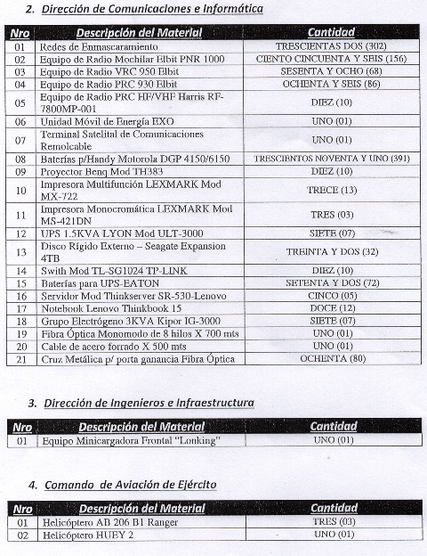 En cuanto a lo que comunicaciones y computación concierne, se pudieron observar distintos elementos de computación cómo discos rígidos externos, impresoras multifunción; baterías de distintos modelos, fibra óptica monomodo de 8 hilos. Para las comunicaciones se entregaron: una terminal satelital de comunicaciones remolcable; Radio Mochilas ELBIT PNR 1000; equipos de Radio Elbit VRC 950 y PCR 930 y Harris PRC HF/ VHF RF-7800MP-001. En cuanto a los vehículos, también se observó una Minicargadora Frontal Lonking para el Arma de Ingenieros. Estos equipos mencionados son apenas una parte de los más visibles, la lista de efectos es extensa en ítems y cantidad y se puede ver en el anexo que acompaña el informe.