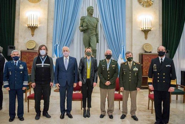 Durante la ceremonia, las autoridades entregaron la “Orden de los servicios distinguidos al mérito” al padre José María Di Paola; al subteniente de reserva, Pablo Deluca; y a la coordinadora de Salud y Bienestar de las Fuerzas Armadas argentinas, Marcela Ovejero, por su desempeño y colaboración en el desarrollo de distintas acciones de ayuda humanitaria y protección social junto al personal militar.