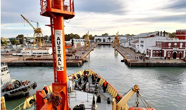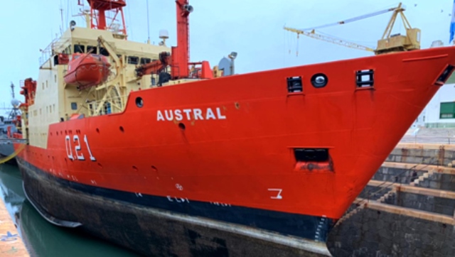 El buque oceanográfico ARA “Austral” (BHAU) en el Dique Nº 1 del Arsenal Naval Puerto Belgrano para dar inicio a su carenado. El buque permanecerá en seco por un lapso aproximado de noventa días. La Armada Argentina brinda este tipo de apoyo logístico al Consejo Nacional de Investigaciones Científicas y Técnicas de Argentina (CONICET) cada vez que resulta necesario. En el primer trimestre de 2017, en el Arsenal Naval Puerto Belgrano se ejecutó el anterior carenado del “Austral”, mientras que en 2018 también ingresó al dique para la instalación de una nueva sonda multi-haz.
