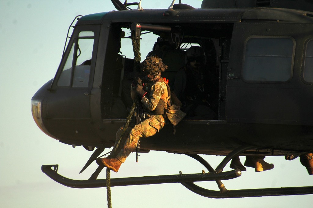 Practica de Fast Rope desde un veterano helicptero Bell.