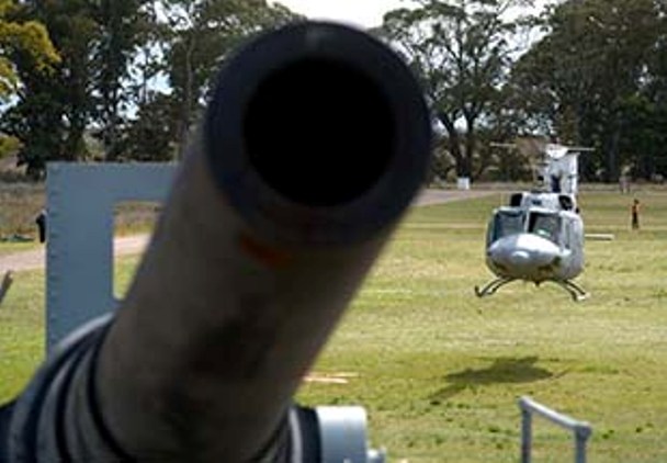 Un helicoptero PUMA del ejercito chileno llega a embarcar tropas.