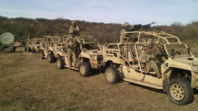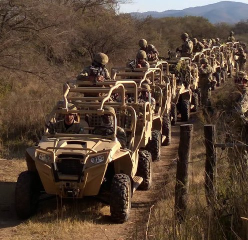 En los extensos campos de instrucción de la Guarnición Militar Córdoba, soldados del Escuadrón de Exploración de Caballería Paracaidista 4, realizaron ejercitaciones con los nuevos vehículos livianos Polaris MRZR 4, de origen estadounidense y provistos a la unidad recientemente.