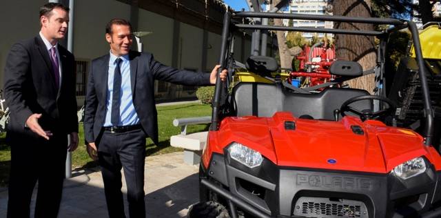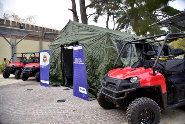 La embajada de los EEUU en Argentina realizó una importante donación de material para asistencia a la comunidad a la provincia patagónica del Neuquén. Se trata de equipamiento para albergar a 250 personas, integrado por carpas dormitorio, cocina de campaña, camastros, piezas de abrigo, además de un centenar de uniformes de bombero y cinco vehículos 4x4 y 6x6 de la marca Polaris, dos de ellos para lucha contra incendios y los otros tres equipados para búsqueda y rescate.