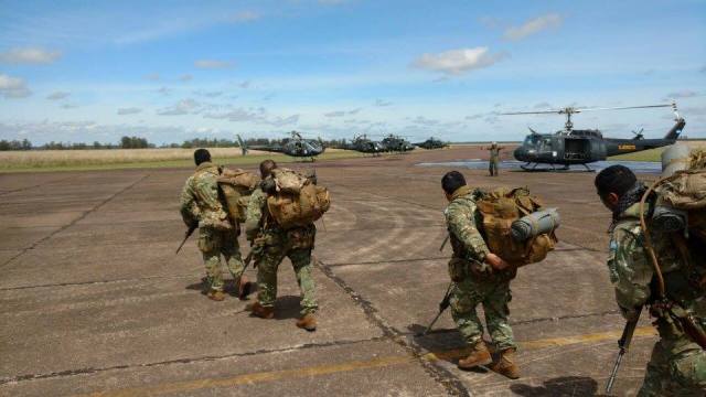 ·Soldados argentinos embarcando en un helicoptero brasileño para iniciar operaciones.