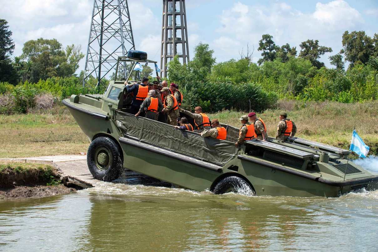Un vehículo anfibio ACL-5 del Ejército Argentino cruzando un paso inundado. (Foto: Ejército Argentino)
