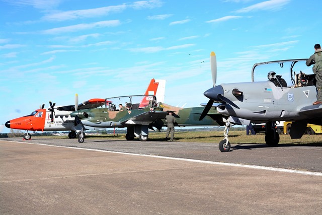 C-130 Hércules, DHC-6 Twin Otter y helicópteros Bell 412 EP. Las aeronaves realizaron una práctica de recuperación y estabilización del piloto eyectado en una zona agreste (Localidad Mazaruca). Por su parte, se efectuó en simultáneo el abastecimiento aéreo a las tropas abocadas al ejercicio de búsqueda, el traslado del personal eyectado desde el lugar de recuperación al aeródromo de Paraná, y la posterior práctica de evacuación vía LearJet 35 A con configuración sanitaria.