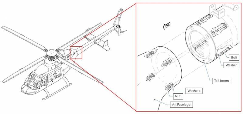 Además, los elementos de fijación del brazo de cola inferior izquierdo, inferior derecho y superior derecho (que conectan el brazo de cola con el fuselaje de popa) se fracturaron y se encontraron, junto con su “hardware” de sujeción, con los restos del brazo de cola. El elemento inferior izquierdo tenía múltiples fracturas por fatiga, mientras que los de fijación superior derecho e inferior derecho tenían fracturas por sobrecarga. El inicio de las grietas por fatiga en el elemento inferior izquierdo indica que el brazo de cola no se separó inmediatamente del helicóptero al dispararse el “hardware” del elemento superior izquierdo.