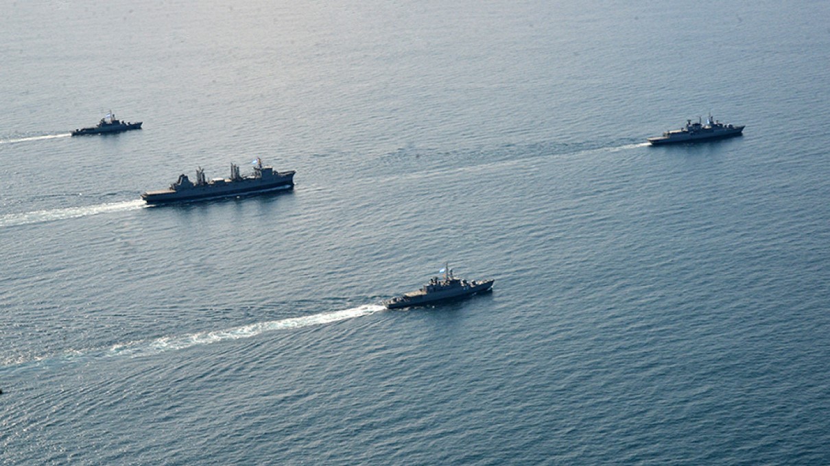 El nuevo P-3C Orion pasando sobre buques de la ARA durante el ejercicio.)