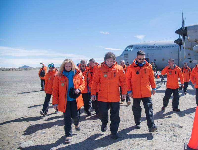 El presidente de Argentina, Javier Milei, junto al ministro de Defensa, Luis Petri, la canciller Diana Mondino, el ministro del Interior, Guillermo Francos, y el director del Organismo Internacional de Energía Atómica (OIEA) de Naciones Unidas, el diplomático argentino Rafael Grossi, visitaron la base Marambio y la base Esperanza, dos de las 13 que la Argentina tiene operativas en la Antártida.