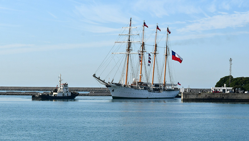 El “Esmeralda”, arribó a la principal ciudad turística del país, donde fueron recibidos por el Contraalmirante Marcelo Paternostro, acompañado por el Embajador de Chile en Argentina, José Antonio Viera-Gallo, y el Agrego Naval de la República de Chile, Capitán de Navío Félix Andrés Miranda Zelada.