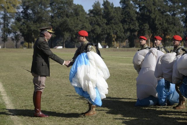 ·El jefe del EA saluda a los paracaidistas que engalanaron los actos.