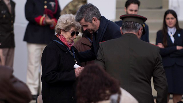 ·El Jefe de Gabinete Marcos Peña entrega un diploma a una madre de un soldados caido en la gesta del Atlantico Sur.
