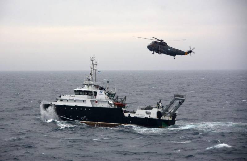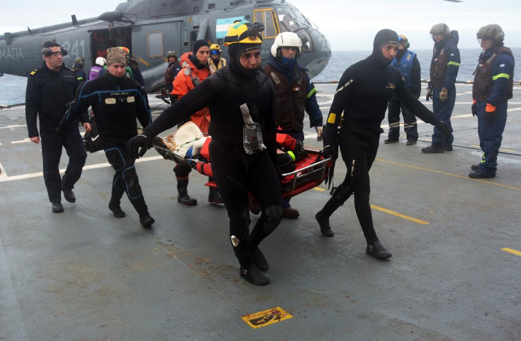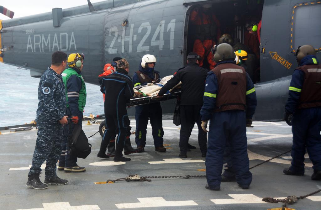 Ante el llamado de auxilio, referido a un tripulante que tenía un grave traumatismo por aplastamiento en su pierna derecha, el rompehielos ARA “Almirante Irizar” que estaba en zona, dirigió uno de sus helicópteros Sea King para desarrollar la evacuación, ciertamente compleja por las condiciones climáticas y que el navío de investigación no tiene un sector apto para el anavizaje de un helicóptero.