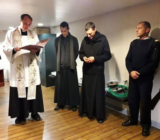 La tripulación compuesta por una treintena de marinos llegó a Francia en avión en octubre para capacitarse y este miércoles zarparán hacia Mar del Plata tras veinte días de navegación. Hace un tiempo atrás oficiales navales se pusieron en contacto con los religiosos para pedirle que bendijera el "A.R.A. Bouchard" antes de partir. Los sacerdotes argentinos acompañados por las religiosas Soeur María de la Sagesse y Soeur Afflicta, recorrieron todo el buque interiorizándose de sus características y de los lugares donde la tripulación habitara continuamente, produciendo un hecho ciertamente histórico para la institución naval que hace varias décadas no compraba un nuevo buque.