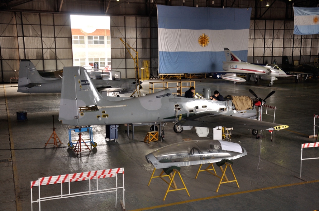 Vista parcial del Hangar de Montaje 1. Se observa el prototipo A-122 y al lado el A-104, el segundo “Tucano” para la modernización de cabina.
