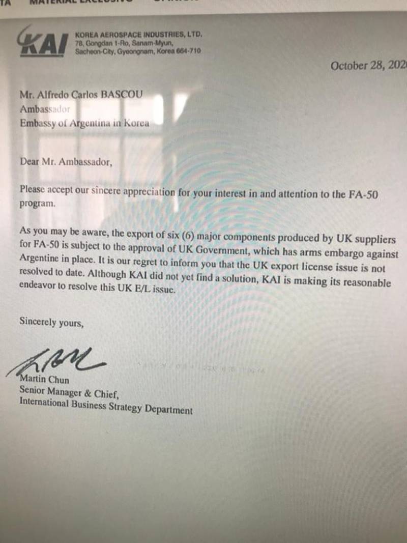 Korean Aerospace Industries (KAI) ha comunicado al Gobierno argentino que no podrá suministrarle el avión de combate FA-50, variante de caza ligero avanzado del T-50 Golden Eagle, que quería la Fuerza Aérea desde los tiempos del Gobierno Macri. La razón es el veto de Reino Unido a tal venta, por los componentes de este país que incorpora la aeronave.