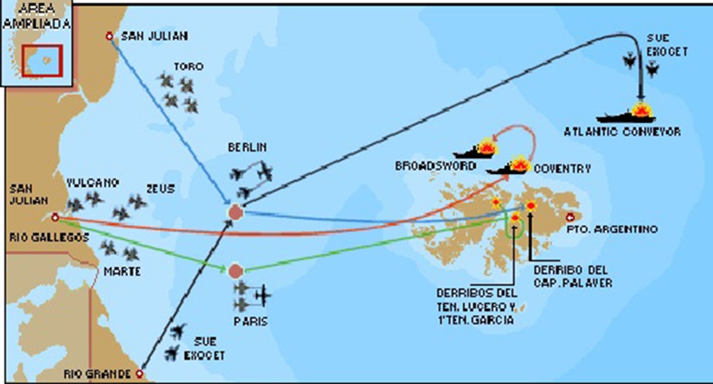 Diagrama del ataque al “Atlantic Conveyor”, pieza clave logística.