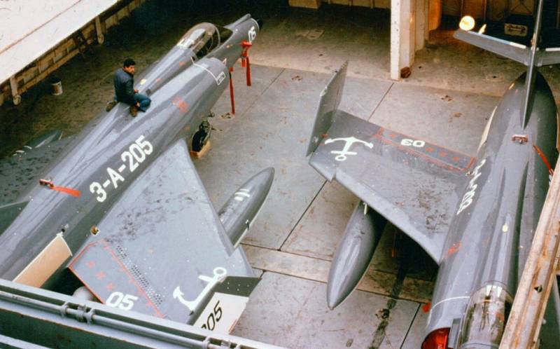Al mando del capitán de corbeta Jorge Colombo, que, una vez los aviones en servicio, sería el comandante de la 2ª Escuadrilla Aeronaval de Caza y Ataque, el grupo de pilotos llegó a Francia el 10 de noviembre de 1980, si bien los oficiales y suboficiales técnicos se encontraban allí desde el día 23 de agosto de ese año. El primero de los reactores fue completado en Bordeaux/Merignac, el 0753/3-A-203, que una vez aceptado fue llevado en vuelo a la Base Aeronaval de Landiviseau por el capitán de fragata Ítalo Lavezzo el 31 de mayo de 1981.