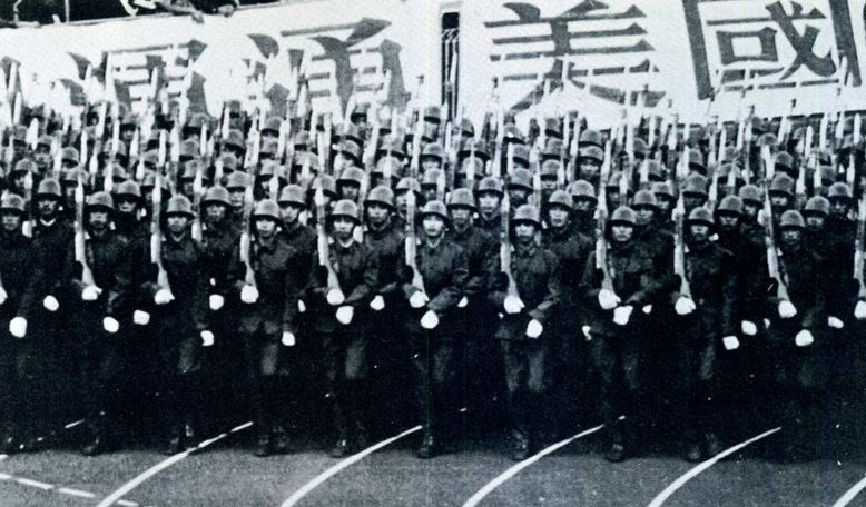 foto: Una extraña fotografía de soldados chinos comunistas con casco, elemento al que no suelen ser muy aficionados.