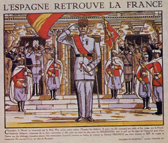 Foto: Una estampa glorificadora publicada en Francia, en 1941, que recoge —con bastante imaginación, todo hay que decirlo— el momento en el que el mariscal francés se apresta a presentar sus cartas credenciales a Franco.
