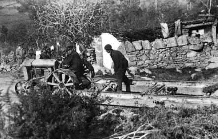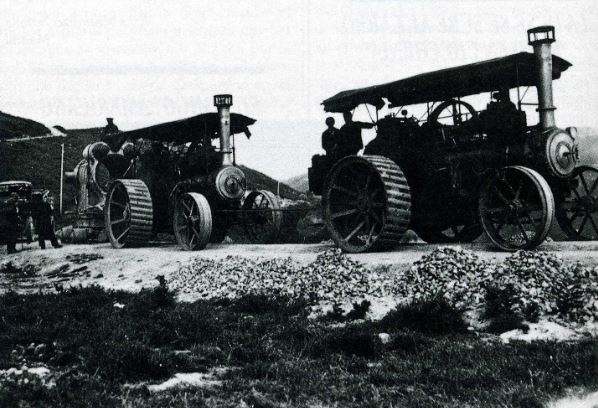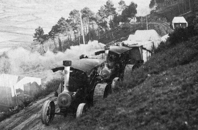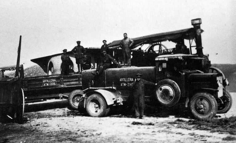 Foto: Dos locomóviles arrastran una cureña sobre una vagoneta.