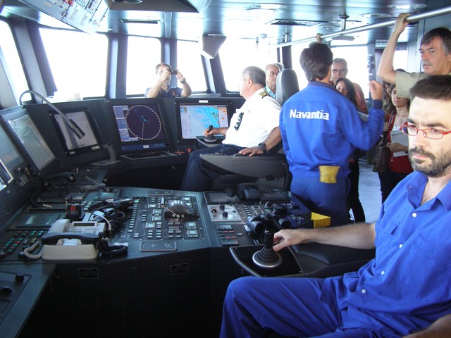 foto: El puente en funciones: a estribor la zona de navegación, con una sola persona al control; a babor la zona táctica, con otro único operador. Están armados de sendos "joysticks" y totalmente arropados por las pantallas