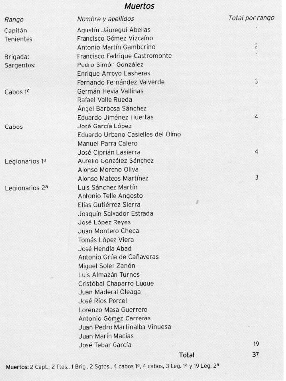 XIII Bandera del A.O.E. (La Legión). Relación nominal, con expresión del rango militar, al 13 de enero de 1958, que resultaron MUERTOS o HERIDOS GRAVES; en el combate que tuvo lugar en el llano de Edchera y fondo de la Saguia El Hamra, según el diario oficial de “Vicisitudes y Operaciones de la Bandera”, hojas 57 y 58. (no incluyo a los “agregados” a la Bandera, aquel día, más fue apenas un pequeño número, irrelevante al caso).