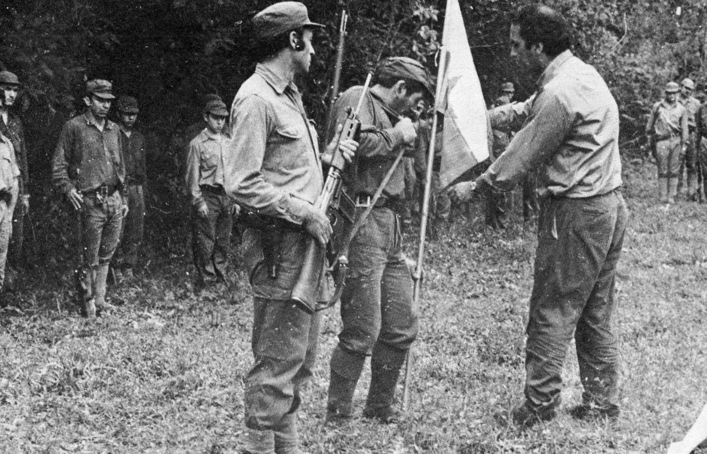 foto: Una ceremonia en un campo guerrillero. Frente a la guardia formada, un miembro del ERP, armado con un fusil, se apresta a estrecharle la mano a uno de sus jefes.