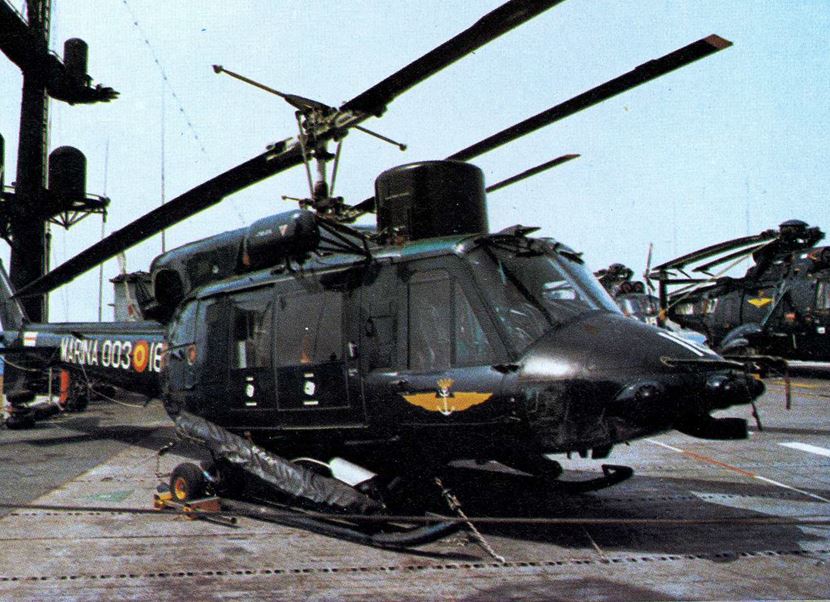 foto: Helicóptero Agusta-Bell “AB-212SW”, de Ia 3ª Escuadrilla de Aeronaves. Desde el inicio del Programa Naval, e incluso antes, se impulsó el Arma Aérea de Ia Armada.