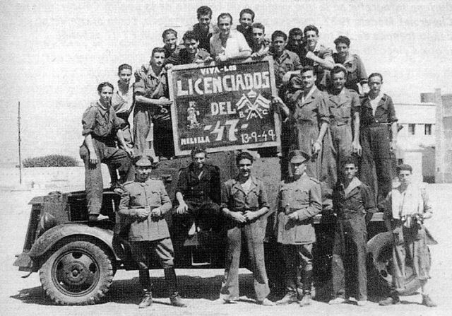 foto: Como demuestra esta instantánea tomada el 13 de septiembre de 1949, con motivo de Ia despedida de los “quintos” del llamamiento de 1947, más de diez años después de su construcción las autoametralladoras (JNL-35 seguían en servicio, al menos en el Regimiento de Caballería Dragones de Alcántara (Foto: Colección J. Murillo Barrero).