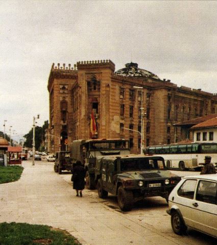 Foto: Vehículos de la Infantería de Marina española frente al castigado edificio de la Biblioteca de Sarajevo.